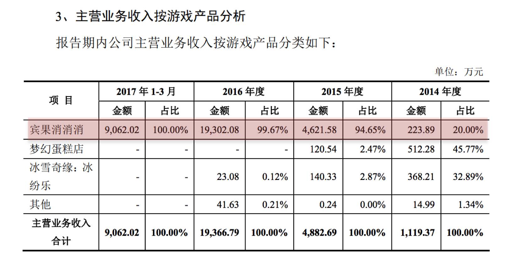 2014年至2016年,《宾果消消消》收入分别为224万元、4622万元、1.93亿元,占比总营业收入分别为20.00%、94.65%、99.67%。这一比重,在2017年第一季度,更是高达100%。