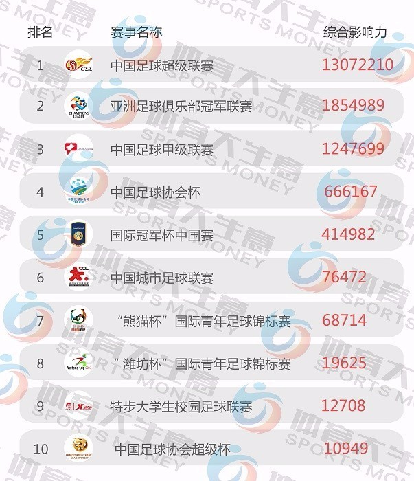 在中国体育改革的进程当中,足球是最焦点的项目。它成为改革的第一块试验田,足协在各体育协会中率先完成“管办分离”,促进中国足球向着全面职业化的理想进发。足球影响榜上,中超龙头地位稳如泰山,榜单前五位均是职业赛事,排名第五的ICC国际冠军杯影响指数超过40万。而过了第五位的分水线,业余赛事佼佼者中国城市足球联赛的数值急跌到五万级别。