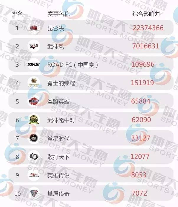 在合共100项上榜赛事当中,共有三项赛事的影响指数达到千万级别。它们分别是昆仑决、中超联赛与CBA联赛。其中昆仑决的影响指数更突破2000万,成为赛事影响榜的“王中王”。以下为十大项目、百大赛事的详细名单及扼要介绍。
