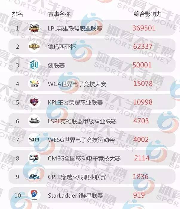 以游戏收入作为运营收入龙头的腾讯,把《英雄联盟》的热潮推到全新高度。从电竞手过招的职业赛事,到偶像明星玩票的狂欢庆典,《英雄联盟》的现象级效应开始影响到非玩家群体。《英雄联盟》官方主办的两项职业联赛、一项杯赛同时上榜,足证“LOL”目前在国内电竞界的地位。与此同时,“腾讯系”中还有《王者荣耀》和《穿越火线》两款游戏的官方职业赛跻身十大。其中《王者荣耀》KPL又与CMEG全国移动电子竞技大赛一同成为2016年手游电竞崛起的代表。