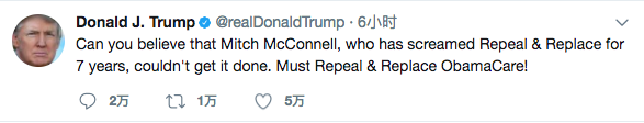 “你们能相信,嚷嚷了七年废除和替代(奥巴马医保)的麦康奈尔却没法将其实现么。必须废除并替代奥巴马医保!”