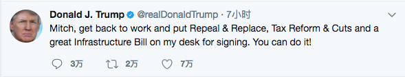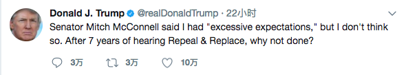 先是周三,特朗普在推特上写道:“参议员麦康奈尔说我‘期望过高’,但我认为不是这样。在听了七年的废除和替代(奥巴马医保)后,为什么还没做成呢?”