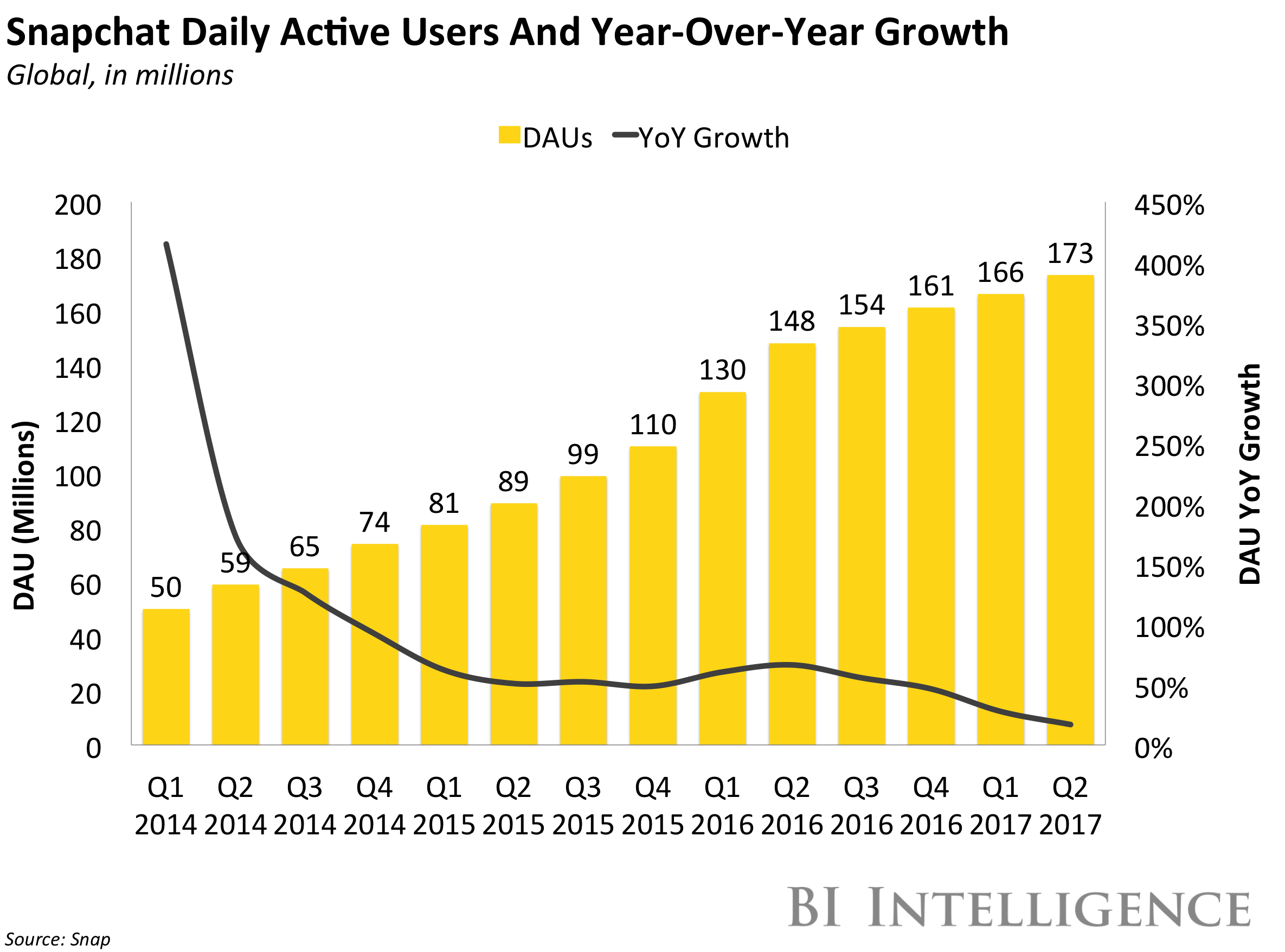 Snap 旗下核心产品Snapchat DAU同比增长持续放缓,当时Q1时的36%,已经打击了华尔街的信心,其股票之后已经一路跳水,现在,Snap处境更是雪上加霜。1.73亿,基本上是Instagram上使用Instagram Stories的用户数。
