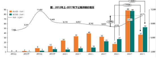2016年受市场大势影响,郑州住宅市场量价涨幅飙升异常,伴随10月份限购政策出炉及数次限购政策的升级,2017上半年调控政策效果初显,整体市场回归平稳,呈现“量跌价稳”的态势。相比住宅市场,在住宅限购政策不断加码的市场形势下,不受限购影响的公寓市场表现出了一定的活力,2017上半年量价虽稍有回落,但整体呈热销态势。