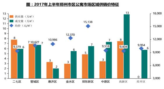 2017上半年,郑州公寓市场分布较为广泛,其中供应以二七区和高新区为主,成交量最大的区域为高新区(12.9万㎡),郑东新区公寓成交价以15138元/㎡的价格领跑全城。