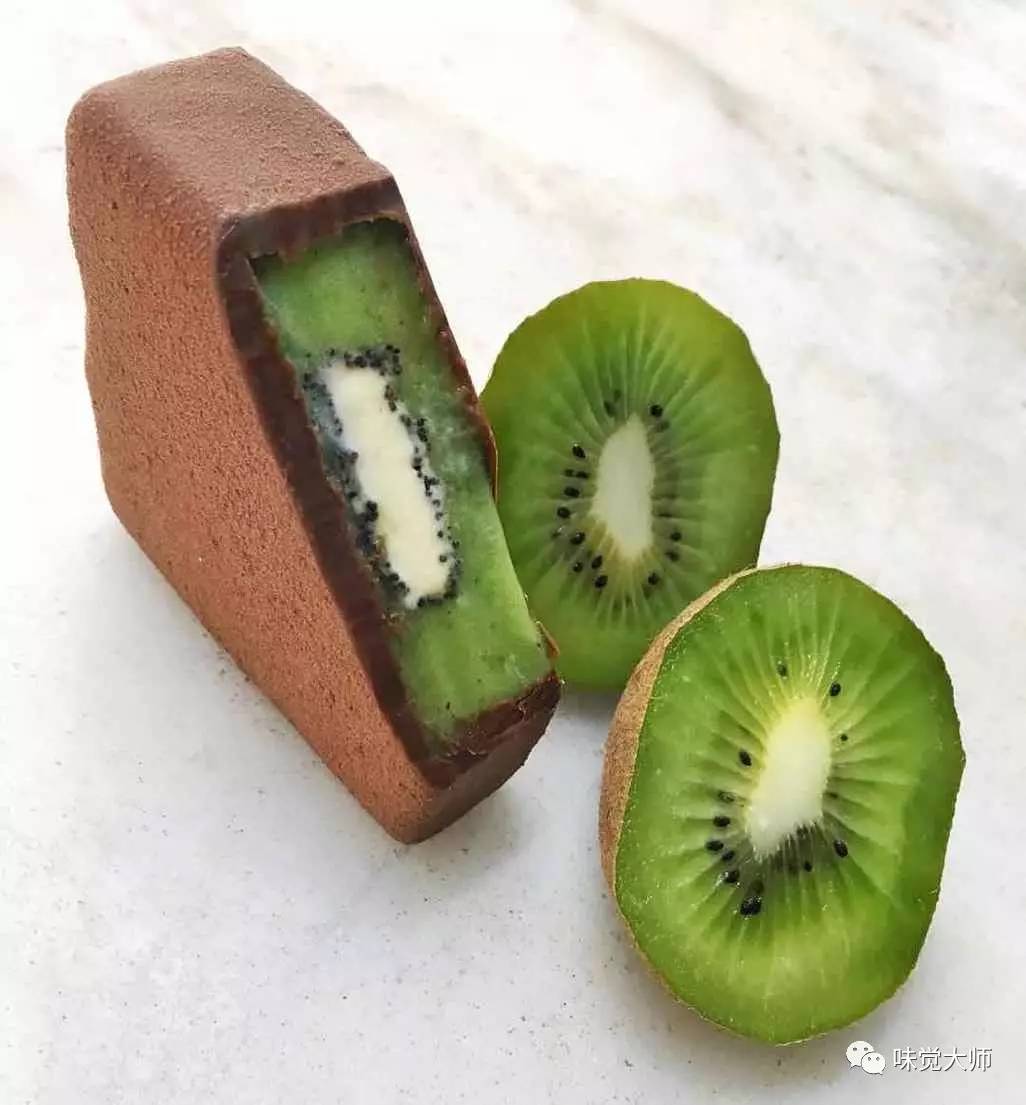 猕猴桃冰淇淋 用猕猴桃汁和香草冰淇淋混合,外面裹上一层奶油巧克力,轻轻切开,仿佛看到里面藏了一颗猕猴桃,清新可爱。