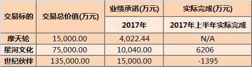 不过,摩天轮及世纪伙伴今年业绩完成情况堪忧。半年报显示,上半年世纪伙伴净利润亏损1395万元,星河文化盈利约6206万元,摩天轮则由于对公司净利润影响未达10%以上并未披露业绩。根据业绩承诺,摩天轮以及世纪伙伴今年分别需要完成4022万元以及1.5亿元的业绩承诺,从上半年完成情况看,情况并不乐观。