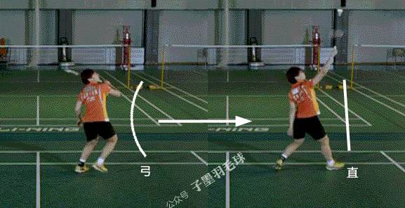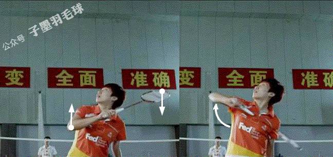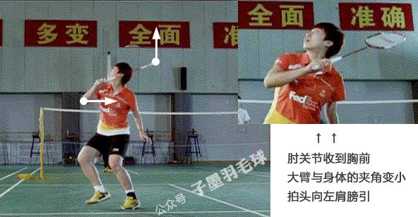 这个引拍动作非常重要,是发力的关键。如果没有抬肘的动作,从准备动作直接击高远球,发力不完全。没有“甩鞭子”的感觉,击球质量大大降低。