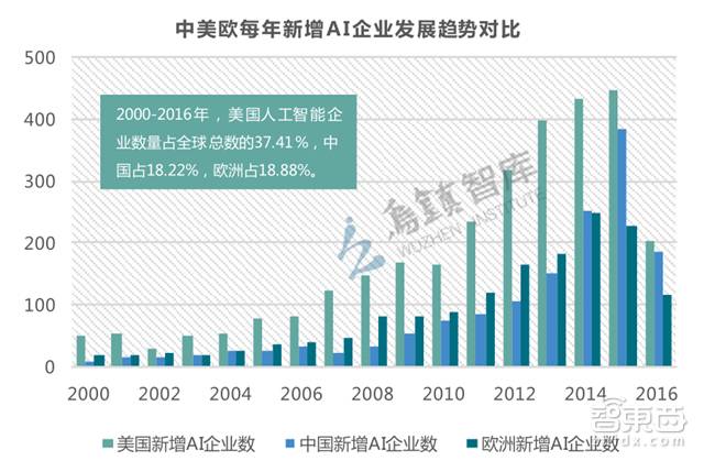 惯例,老美在人工智能这一领域也是领先全球的,并且已经领先很多年了,2016年企业数累计超过3033家,融资规模累积超过207亿美元;其次是中国,1477家,27.6亿美元,2014-2016年三年是中国人工智能发展最为迅速的时期;然后是欧洲,企业数与中国相当。2000-2016年,中美欧新增人工智能企业数占全球总数的近75%。