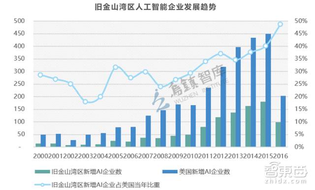 其中,2000-2016年,旧金山湾区人工智能新增企业数,超过美国人工智能企业总数的三分之一,超过全球除中国外的其它国家,企业总量占全球的12.91%。在旧金山湾区众多城镇中,以San Francisco、Palo Alto的人工智能企业最多,两者的数量之和超过旧金山湾区的一半。