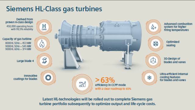 从2000年到2010年,西门子将联合循环电厂的发电效率从58%提升到60%;在2016年提升到61.5%,1.5个百分点花了6年时间。三个型号的HL级燃气轮机都可实现超过63%的联合循环效率。