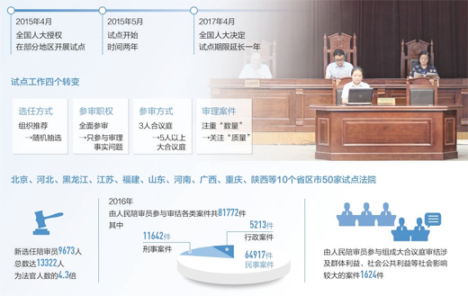2015年4月,中央全面深化改革领导小组第十一次会议审议通过了《人民陪审员制度改革试点方案》。围绕改革人民陪审员选任条件和选任程序、扩大人民陪审员参审范围、完善人民陪审员参审案件机制、探索人民陪审员参审案件职权改革、完善人民陪审员退出和惩戒机制、完善人民陪审员履职保障制度等重要环节开展试点,提高人民陪审员广泛性和代表性,发挥人民陪审员制度的作用。如今,50家试点法院已经全部按要求完成人民陪审员选任工作,一批通民情、知民意、接地气的普通群众被选任为人民陪审员。