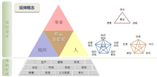 当企业完成了事业、组织和人的顶层设计以后,在基础管理,包括生产、营销、研发、安全、环保、财务、采购、销售、信息、人力资源、审计等等方面全部都要进行重新的设计。这是非常关键的顺序,是不可以倒过来的。