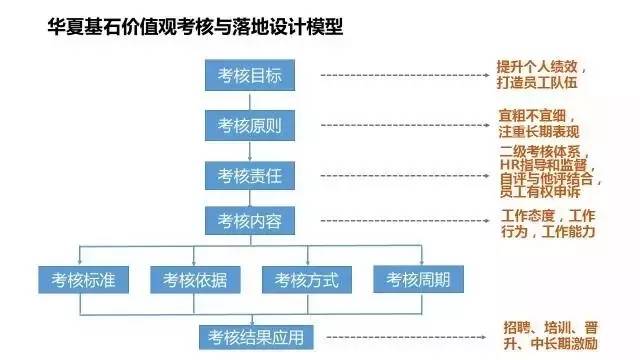华夏基石的价值观考核体系包括:考核目标、考核原则、考核责任、考核内容等,它取代了行为规范,把公司的核心价值观或者说公司特别强调的几个价值理念直接变为行为特征和考核方式,并与干部的晋升、激励等等直接相关。