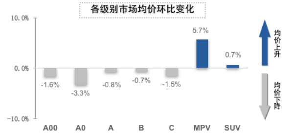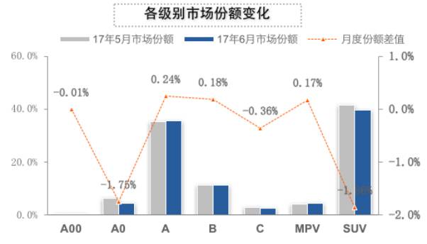 所以在销量此消彼长中,市场份额也出现变化,基于增速的不同,SUV市场连同A00级、A0级和C级市场均出现了环比下降,其中SUV的市场份额环比下降1.86%。