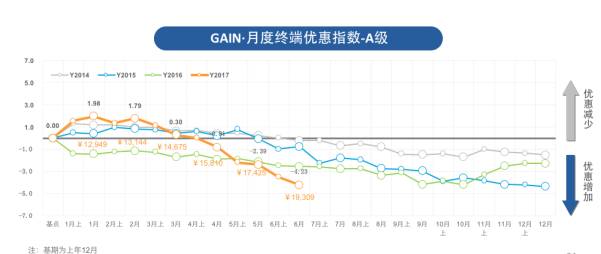 在月度价格指数上,6月份已经比5月份降低了2300元,而 A级别终端优惠指数为-4.23,环比下降10.8%!而且,这已经是A级市场自今年1月份以来连续第4个月下降,且优惠指数已经超越去年同期。