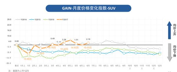 而GAIN·6月,SUV价格变化SUV价格变化指数为2.19,环比增加0.7%,市场均价从14.93万增加至15.03万,小幅增加1000元。主要是本月权重车型哈弗H6的 加权成交价格降幅明显,而宝骏510、CS35等车型的销量权重又有所增加,因此该级别整体价格保持基本稳定。