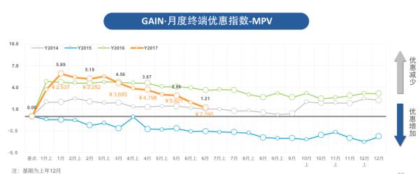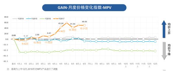 2017 GAIN·6月MPV价格变化指数为49.55,环比上升5.7%,市场均价从14.39万上升至15.21万,成交价格本月出现了上升,升幅为8,200元。