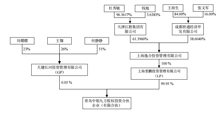 资料显示,中银九方成立日期为2017年7月28日,注册资本20.69亿元,注册地址为山东省青岛市市北区威海路273号729室,天健长河投资管理有限公司(GP)持股0.05%,上海里鹏投资管理有限公司(LP)持股99.95%。上海逸合投资管理有限公司持有上海里鹏投资管理有限公司(LP)100%的股权,再往上追溯,天津江胜集团有限公司和成都世通经济开发有限公司,分别持有上海逸合投资管理有限公司61.396%和38.604%的股权。中银九方的实际控制人为何静静,其旗下企业还有仙居县何静广告有限公司(直接持股20%)、中科迪高投资(北京)有限公司(直接持股90%)、宁波丰济富行股权投资合伙企业(有限合伙)(直接持股65%)、杭州基尔进出口贸易有限公司(直接持股90%),另有3家杭州海熙投资管理有限公司、台州弘润置业有限公司、浙江万润资产管理有限公司,均由其亲属控制。