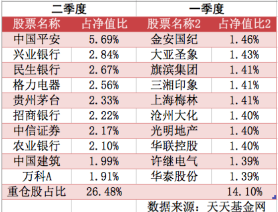 从上表可以看到,二季度出现了两方面的变化:一方面提高了持股集中度,前十大重仓股从原来的14%提高到26%,最高占比从1.5%提高到5.7%;另一方面持仓股从中小创换成了显著的大盘价值风格,前十大重仓股与沪深300权重股高度重合。