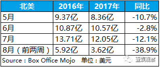 从5月至今,北美今年的暑期档票房同比2016年已连续3个月缩水:2016年的5、6、7月,北美的票房分别为9.37亿、10.87亿、13.71亿美元;到了今年,这三个月的票房分别缩减至8.36亿、10.57亿与12.05亿美元,3个月的票房已经比去年少了将近3亿美元。