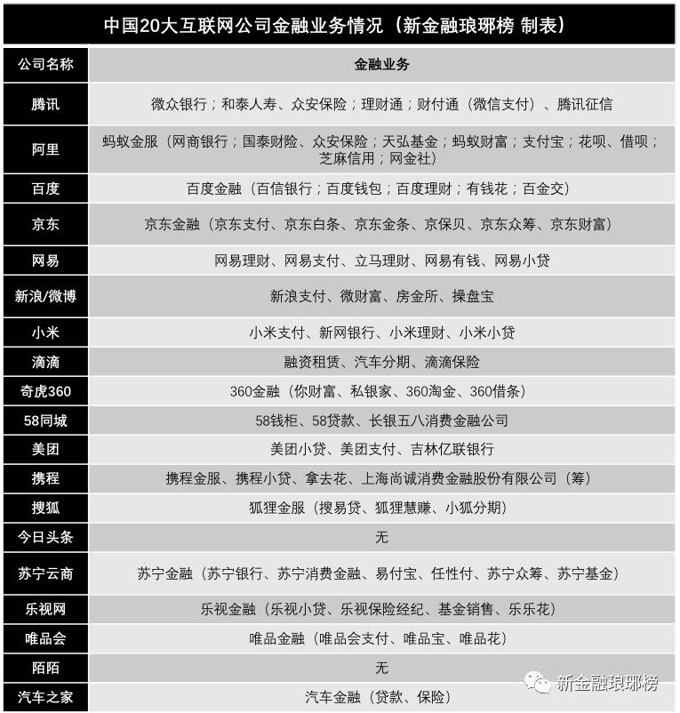 这里说的互联网公司,指的是大型互联网公司。新金融琅琊榜选取了国内市值和影响力靠前的20家互联网公司,基于公开信息,对其开展金融业务的情况进行了梳理。