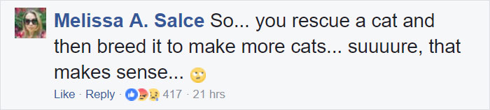我就不明白了,一个收容所怎么能让饲养员收养猫,并且不给猫做绝育呢?她只会繁育出更多的“可爱的”小猫来加剧猫数量过多的问题。这家收容所真的应该好好检查一下自己的领养政策了。