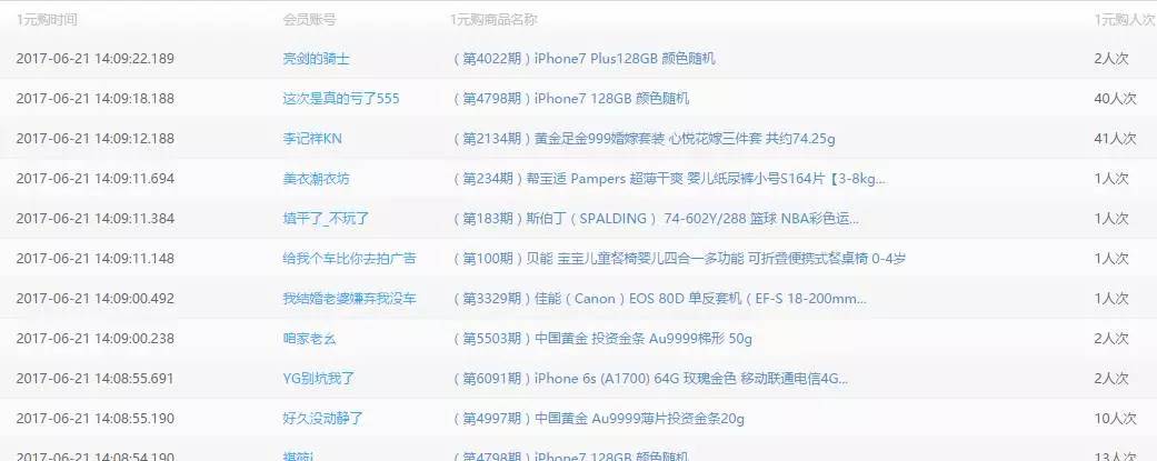 在某个一元购平台网页上,实时更新参与者信息。经粗略统计,平均1分钟就有超过30人次的参与者加入。一天下来,有43200人次参与,即支付43200元。