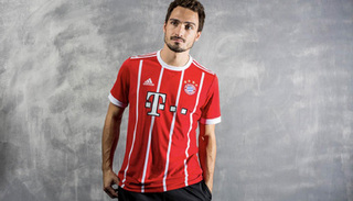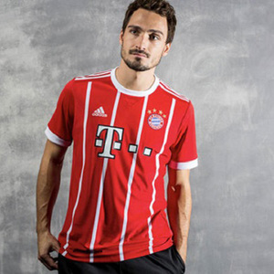 拜仁从不生产过多款式的球衣,这次2017-18赛季的主场球衣也不例外。其设计灵感来自1974年的欧洲杯球衣,当年,伟大的盖德·穆勒和弗朗茨·贝肯鲍尔身披这件球衣带领拜仁赢得欧洲杯的冠军。这款球衣的特色是有四条白色的竖条纹均匀分布在以红色为主的球衣上,袖子和衣领还镶上额外的白边。