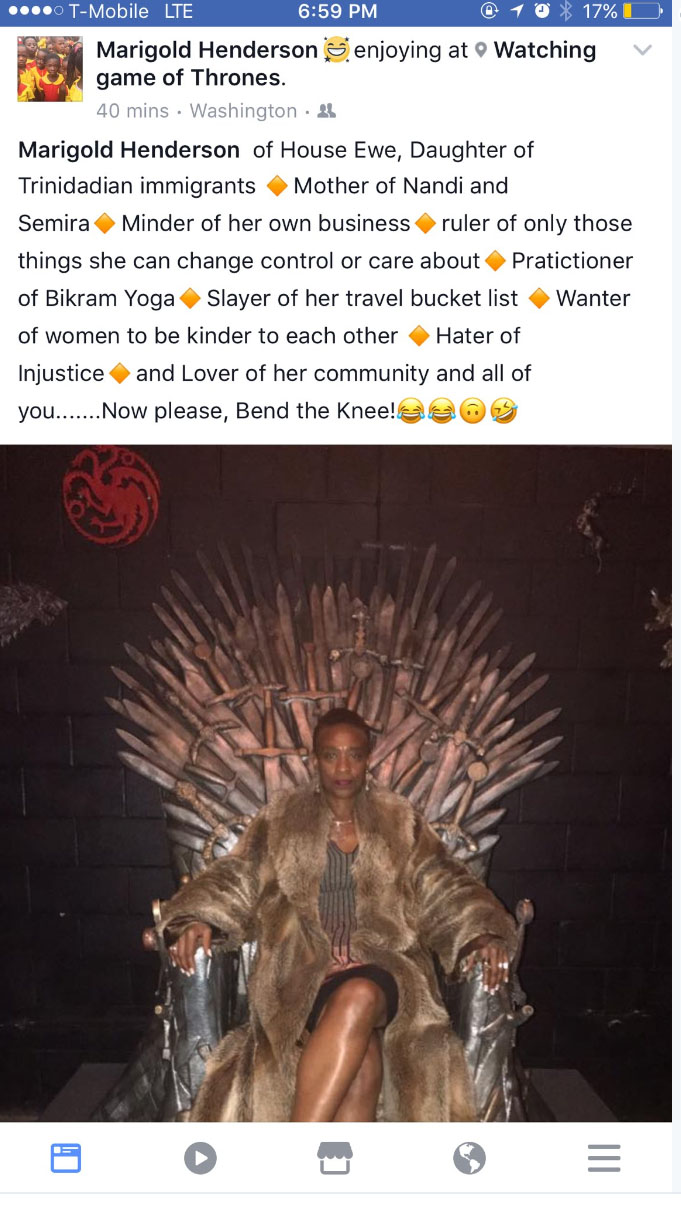 “艾维家的Marigold Hendreson,特立尼达移民之女,两娃(Nandi和Semira)之母,不管闲事儿者,自己事情的统治者,瑜伽修行者,旅行目的地清单斩杀者,女人间互相友好的理想保持者,不义反对者,社区和你们大家的爱护者。