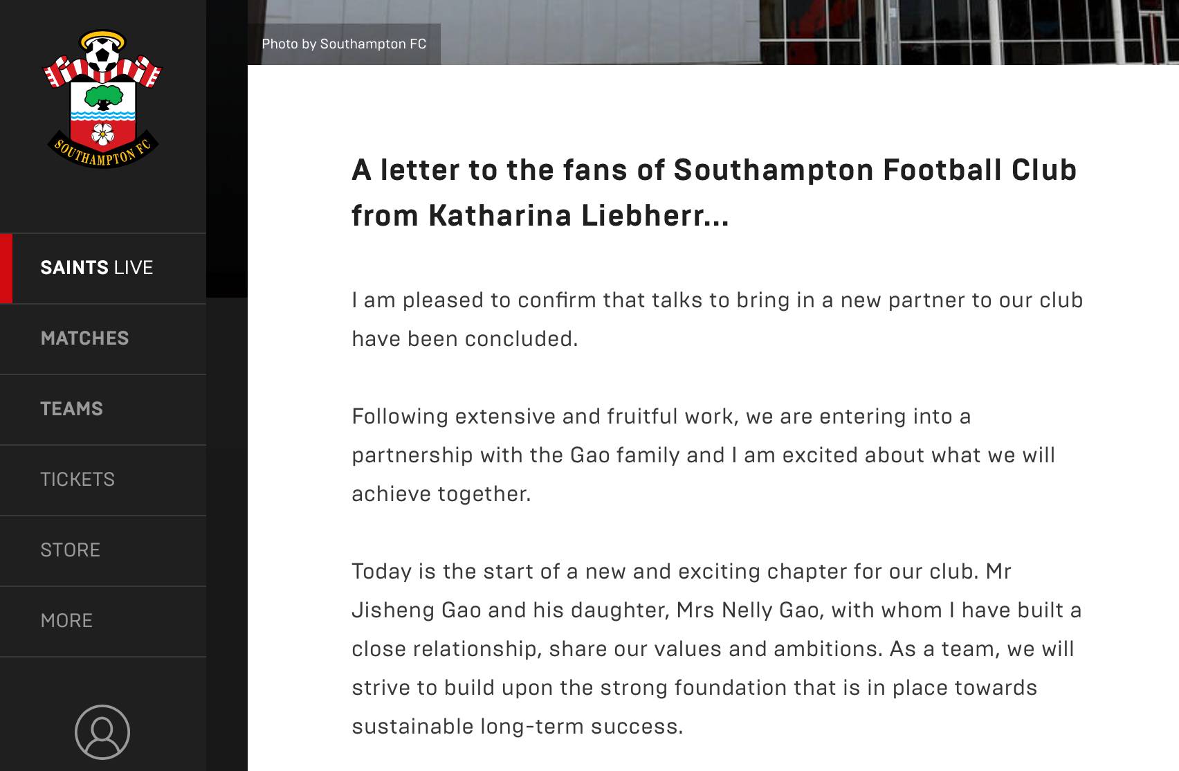 但是,即便俱乐部在英超处境不错,这次为球迷写亲笔信的前圣徒女掌门人心思却不在足球上。在被收购之前,俱乐部的拥有者凯特琳娜是前俱乐部老板马库斯-利布赫尔的女儿。在父亲2010年去世之后,凯特琳娜一直希望出售俱乐部,高继胜的出现很是时候。