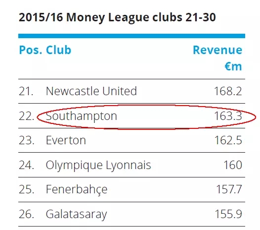 2015/16赛季,南安的收入达到创俱乐部记录的1.633亿英镑 via 德勤