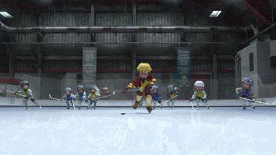 我真的去了冰球场,其实当时我还在一个球队里,所以我的装备都在,然后有天吃完午饭以后,我跟我的同事们去了那里,他们就拍了一些我摔倒啊,棍子飞来飞去啊,这些镜头,然后他们还绕着场滑冰,逗我玩,总之那天特别好玩。