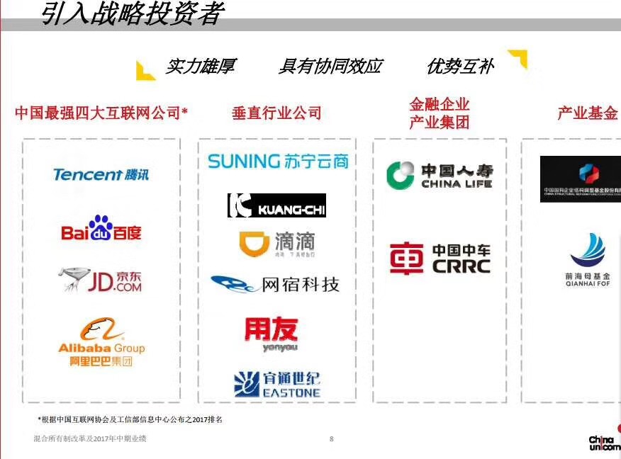 8月16日,中国联通董事长王晓初在中期业绩发布会上公布混改方案,宣布将引入包括腾讯、百度、京东、阿里巴巴在内的多位战略投资者,认购中国联通A股股份。