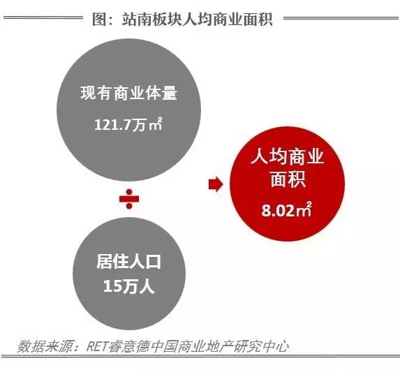 按照国际标准,人均占有商业面积在 1.2平方米是一个比较合适的参照值,而站南板块现有商业体量121.7万平方米,人均商业面积高达8.02平方米,板块商业严重过剩。