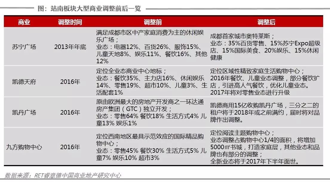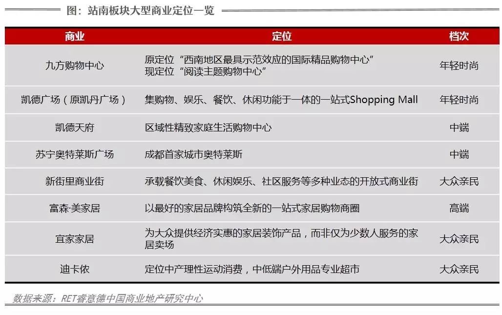 从站南商业类型来看,板块内除了综合性的购物中心,还有富森美家居、宜家家居、迪卡侬等专业店,其中,富森美家居和宜家家居虽然同为家居专业店,但各自定位不同,目标客群不同,形成家居市场的互补。另外,经过调整后,站南板块内四大购物中心(九方购物中心、凯德广场、凯德天府、苏宁奥特莱斯广场)的定位清晰无重叠,避免了同质化竞争。