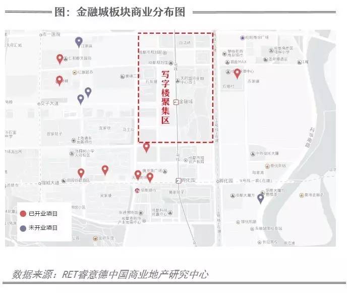 从金融城板块商业分布图来看,目前写字楼最集中区域目前没有成规模的商业。虽然未来将有中海环宇荟、悠方等定位中高端的购物中心即将面世,但是针对商务办公人群消费的特性来看,购物中心不能方便、快捷的满足商务办公人士的消费需求。