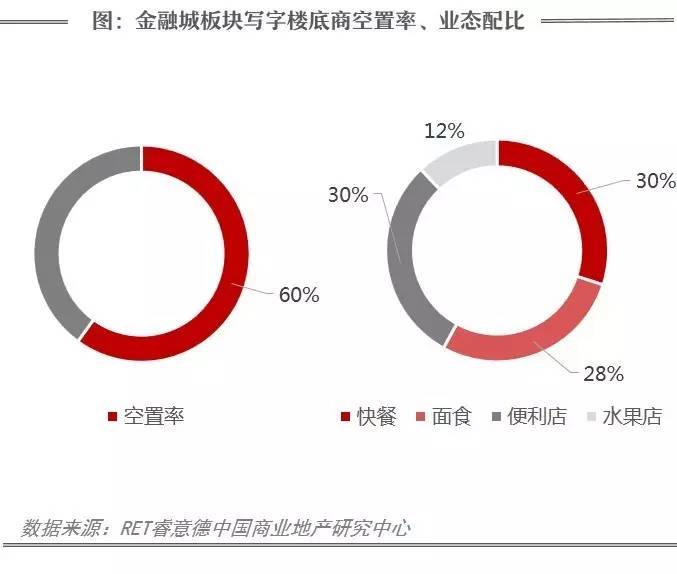 目前金融城板块商务办公集中区仅少数写字楼带有底商,且空置率较高,业态单一,以快餐、面食、便利店为主,无法满足高收入商务人群的消费需求。