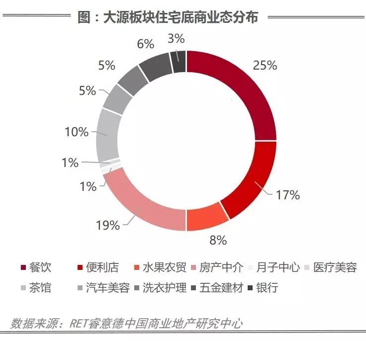 大源板块目前交付入住的住宅小区有31个,其中自带社区底商的项目有11个,商铺空置率高达45%,业态以餐饮(25%)、房产中介(19%)、便利店(17%)等业态为主,仅够满足居民最基本的消费需求。