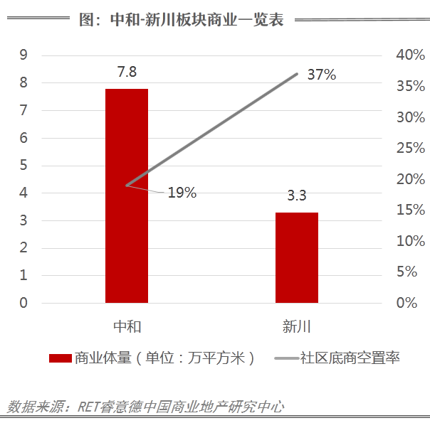 新川真正呈现的商业项目仅有中德英伦联邦、新怡花园、黄金时代,且均以社区底商为主、空置率较高。而中和区域由于过去中和镇的人气支撑,区域成熟度较高,人气明显旺于新川,已呈现商铺体量多于新川,商铺空置率相对较低。纵观整个中和—新川板块,中和区域商业着重于解决居民日常生活需求,新川则服务于未来的产业人口。