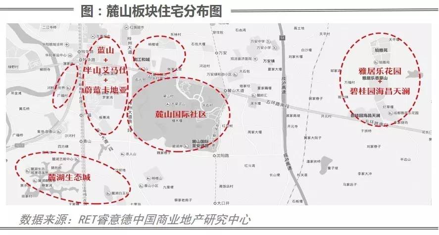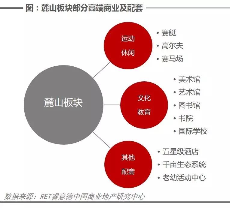 麓山作为成都主要的别墅板块之一,区域内别墅产品总面积达58%,价格在260-3600万元/套之间,主要购买对象为高净值人群。针对住宅产品及购买人群的特性,麓山板块陆续出现了不少高端、注重生活品质的商业及配套设施。