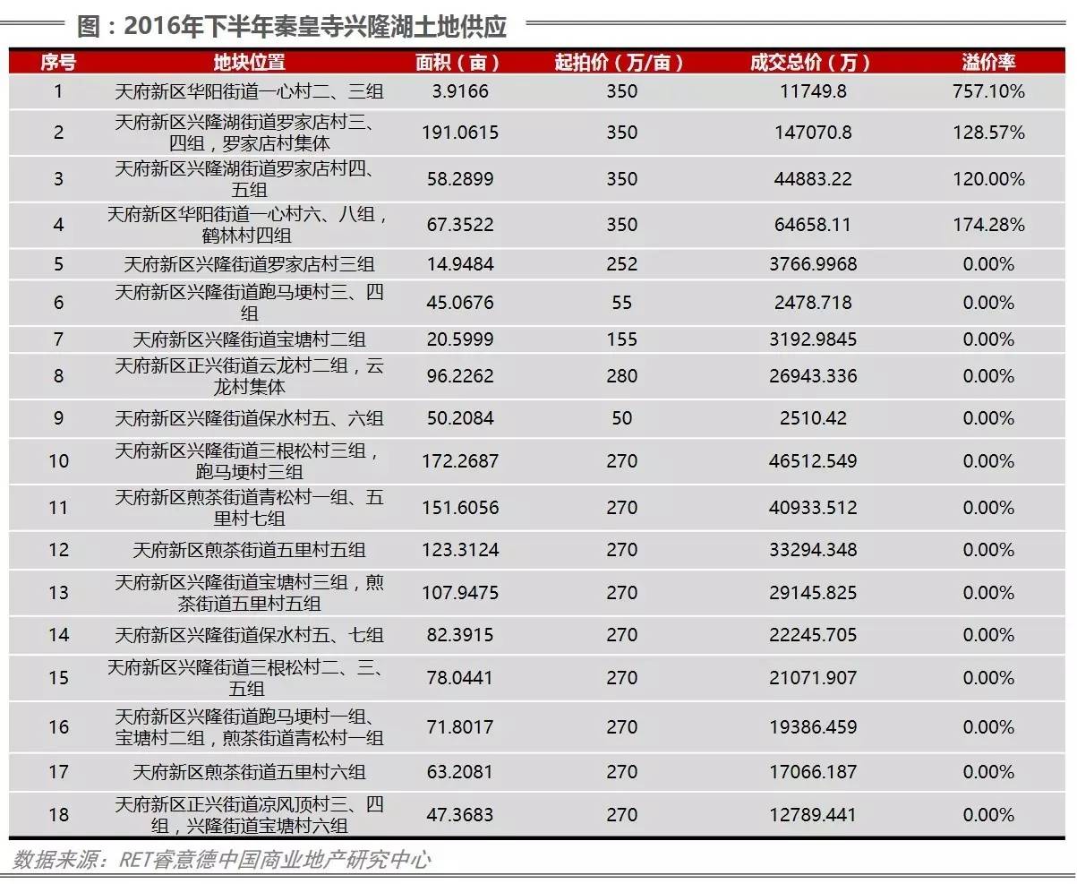近两年,兴隆湖所属的秦皇寺板块累计出让23宗合计2700亩土地。其中成交22宗合计2644亩,流拍一宗56亩的商服用地。区域在2016年下半年出让加速,共计18宗土地上市,无任何流拍,合计成交面积1445.6186亩,平均溢价率65.55%,总计54.97亿土地出让收入,整个区域土地供应充足。
