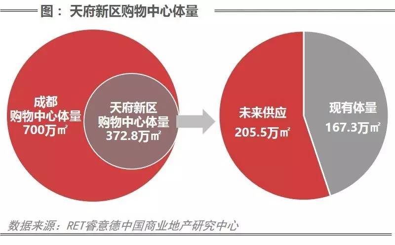据RET睿意德中国商业地产研究中心数据显示,目前天府新区八大热点板块中,购物中心总体量达372.8万㎡,占成都购物中心总体量的53%,其中现有的购物中心体量达167.3万㎡,而未来还将有205.5万㎡的购物中心体量将面世。