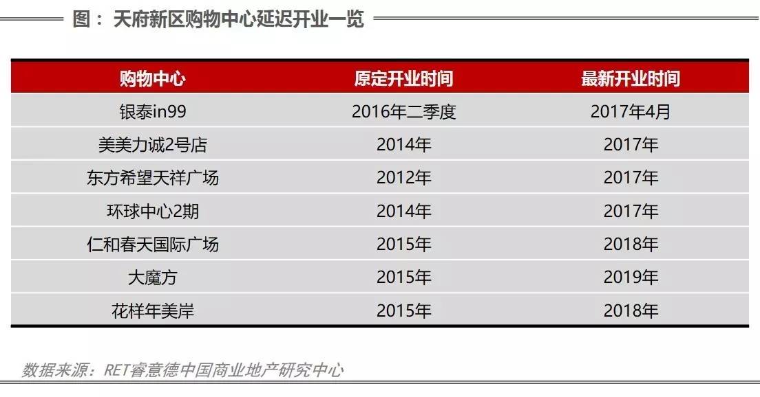 据中成房业《2016年成都房产市场年报》的数据显示,受成都商业市场高存量的影响,房企延缓商业项目开工,导致供应减少,大成都范围内供应量为364.16万㎡,同比下滑21.7%;成交面积156.72万㎡,同比下跌20.1%,是近5年来商业平均销量的新低。天府新区作为购物中心存量大区,竞争更加激烈,近几年购物中心推迟开业的情况较为频繁。