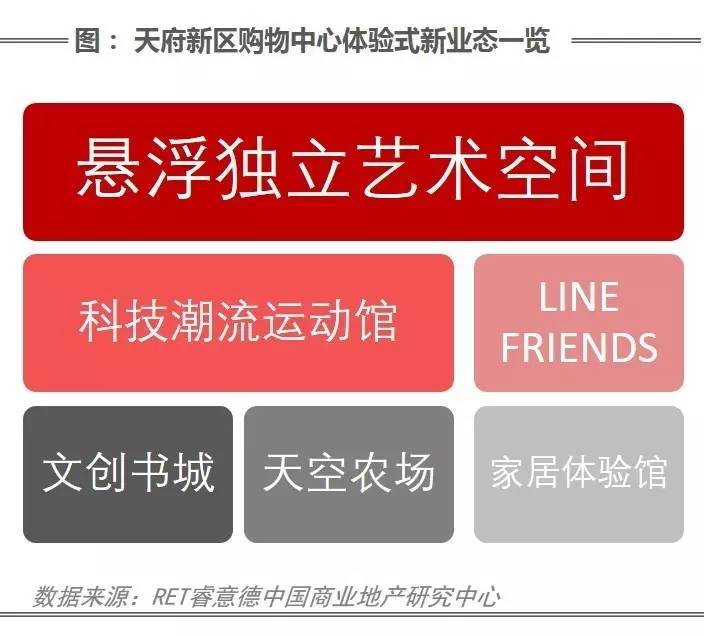 传统购物中心与体验式购物中心的最明显的区别,是其商业体中大幅增加休闲娱乐、餐饮占比,传统上业态组合中的黄金比例——零售、餐饮、娱乐“52:18:30”已被时代抛弃,目前天府新区不少购物中心将零售占比下降到30%~40%左右,而体验式业态在不断增加。 “不止是卖东西,而是提供新的生活方式”,成为天府新区购物中心发展的新理念。