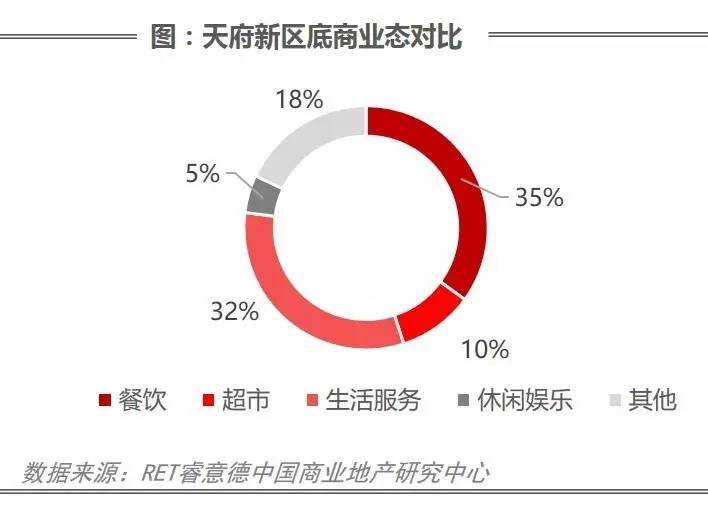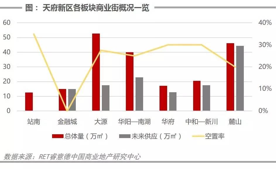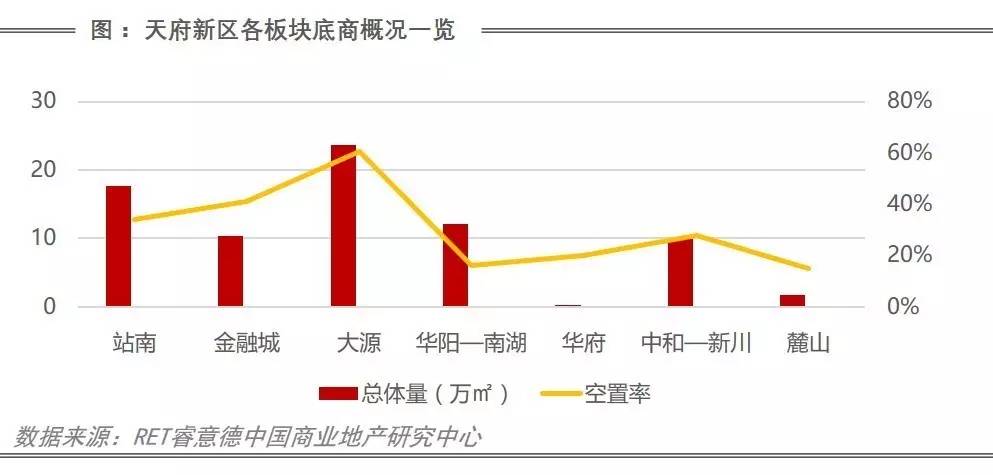 天府新区八大板块底商(包括社区底商和写字楼)总体量为75.65万方,未来供应量为6.5万方,空置率为30.6%。业态单一,仅能满足居民最基本的消费需求。