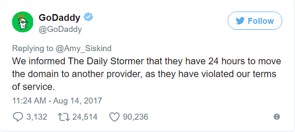 除了Fabook和Reddit,许多科技公司在此次暴力事件后也开始打击线上仇恨组织。美国主机服务公司GoDaddy宣布取消新纳粹网站The Daily Stormer的域名申请。