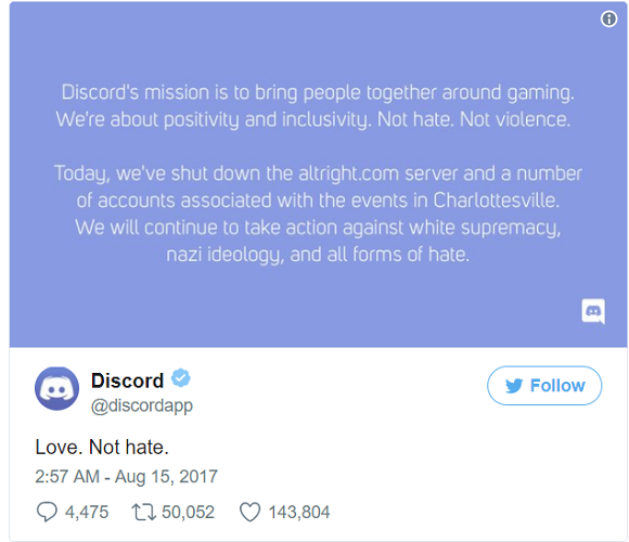 另外,游戏聊天软件Discord也封禁了与此次暴力事件有关的账号。就此封禁措施,Discord解释,公司会抵抗任何形式的仇恨行为,以及这次封禁行为的目的是为了平台的积极性及包容性。此公司表示,虽然审查内容并不是最好的选择,但他们相信如果不能清除威胁性内容,言论自由就得不到保障。