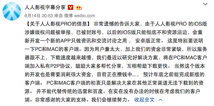 据IT之家8月15日消息,人人影视PRO iOS版被迫下架。8月14日晚,@人人影视字幕分享官方微博对此做出了回应。