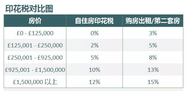 自2016年4月1日起,英国开始上调印花税的征税体系,规定购买第二套住房或出租房的买家,需要在现有的递进式印花税基础上每级多缴付3%的税。例如,购买一套价格为50万英镑的公寓,增收前买家需要缴付1.75万英镑的印花税;但在新印花税政策实施后,买家则需要缴纳3万英镑,整整多了1.25万英镑。